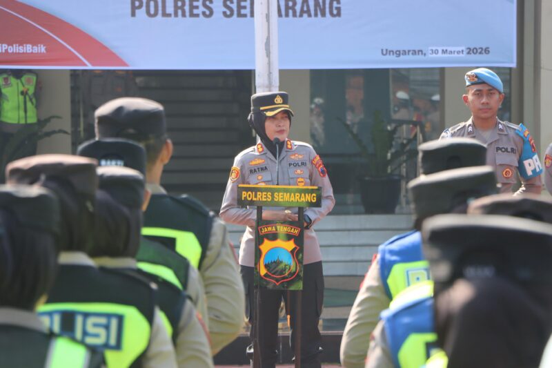 Kapolres Semarang, AKBP Ratna Quratul Ainy, S.I.K., M.Si., menyampaikan apresiasi dan ucapan terima kasih kepada seluruh personel saat memimpin apel pagi di Lapangan Tri Brata Polres Semarang, Senin (30/3/2026).