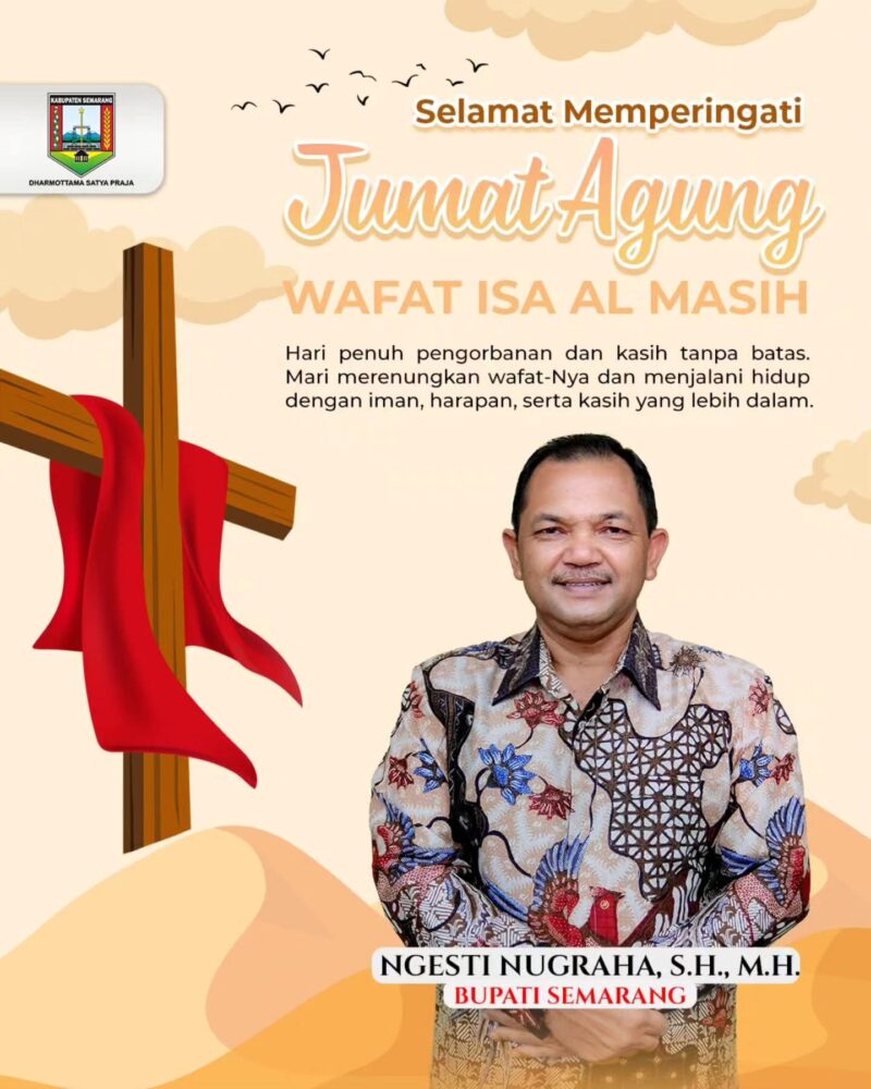 KABUPATEN SEMARANG | MERDEKA1.COM – Bupati Semarang, H. Ngesti Nugroho, menyampaikan ucapan Selamat Memperingati Jumat Agung Tahun 2026 kepada seluruh umat Kristiani, khususnya di wilayah Kabupaten Semarang.